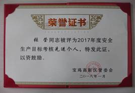 1月25日,公司荣获宝鸡市高新技术产业开发区“2017年度安全生产先进企业”称号;公司专职安全员张莹同志喜获高新区“2017年度安全生产目标考核先进个人”称号。公司和张莹同志自2012年以来,已连续6年获得该项殊荣。